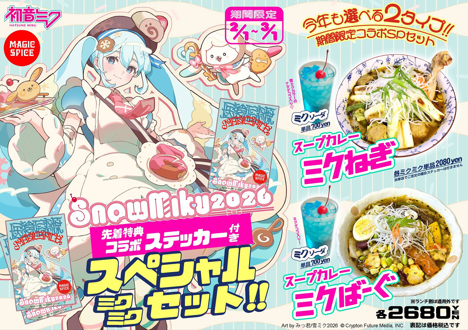 対象メニュー1品ご注文につき、SNOW MIKU 2026のイラストを使用した、非売品ステッカー(全6種)をランダムで1枚プレゼント!