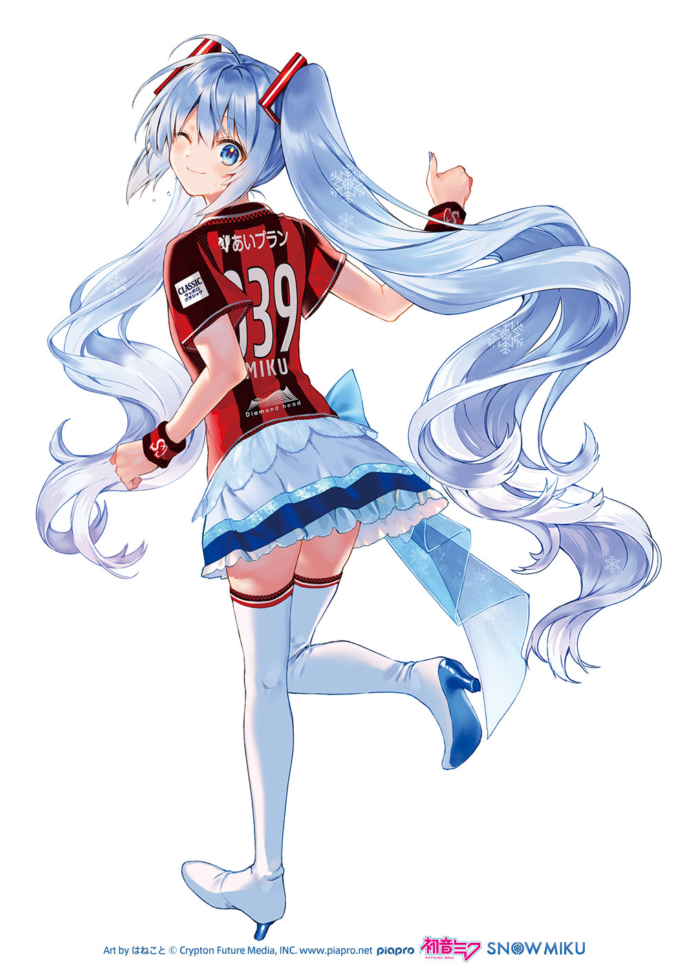 北海道をホームタウンとするサッカーJリーグ『北海道コンサドーレ札幌』と、雪ミクがともに北海道を盛り上げていくべくコラボレーション。赤と黒の縦じまのユニフォームをまとった雪ミクが、コンサドーレを全力で応援!